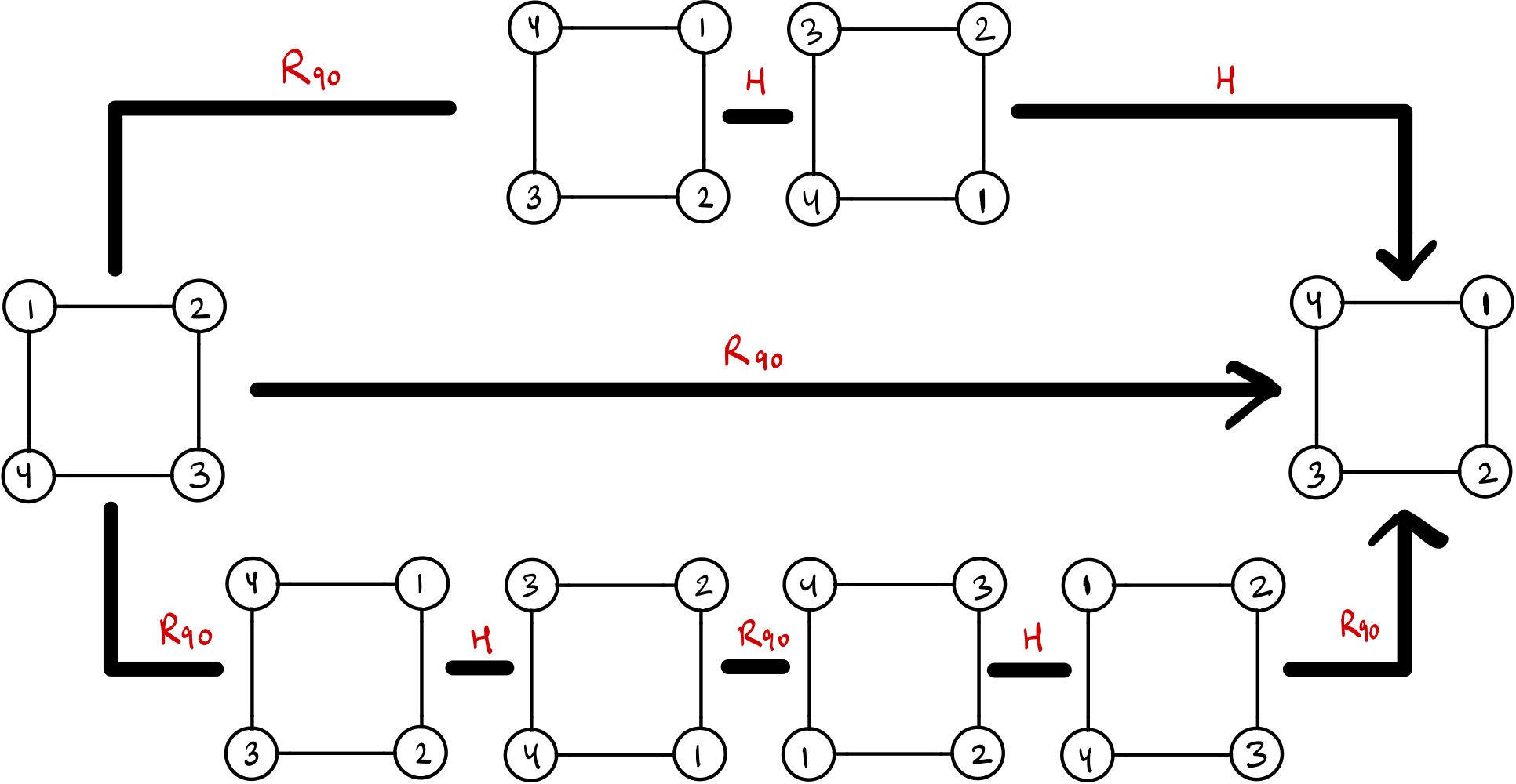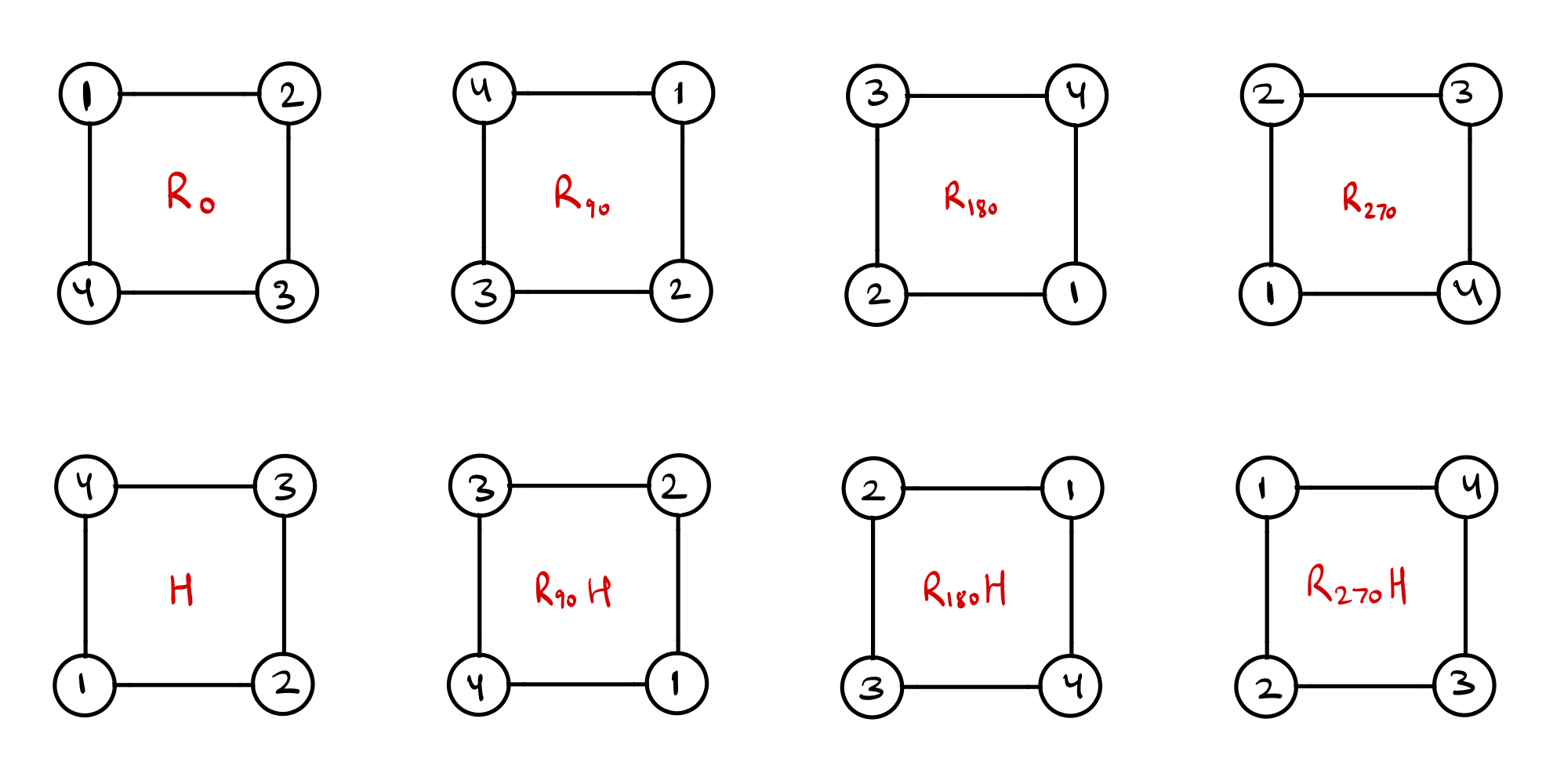 Notice how many different ways of composing together transformations gives the same final configuration. I want to denote rotation by \(x^\circ\) as \(R_x\) and \(H\) for the horizontal flip.